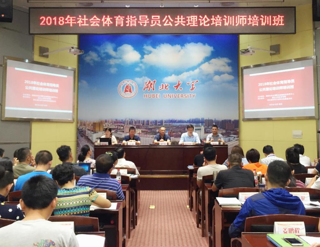 2018年6月13日八点半于湖北大学会议中心思诚厅召开了2018年全国社会体育指导员培训师培训班的开班仪式。来自全国25个省86位学员汇聚湖北大学共交流同学习。本次培训班由国家体育总局职业技能鉴定指导中心举办,湖北大学体育学院、365大陆体育备用网址承办。出席本次仪式的领导主要有:湖北大学蒋涛副校长、国家体育总局职业鉴定指导中心职业技能鉴定管理部副主任钱王子迪、湖北大学体育学院刘勇院长,湖北省体育人才服务中心主任王聪。开班仪式由国家体育总局职业鉴定指导中心张雪婕主持。